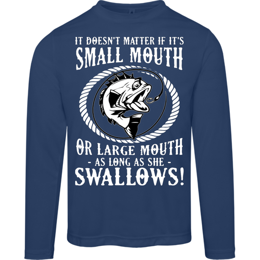 Fishing Long Sleeve Tee: "Small Mouth or Large Mouth, As Long As She Swallows!" – Moisture-Wicking & UV Protection for Anglers!