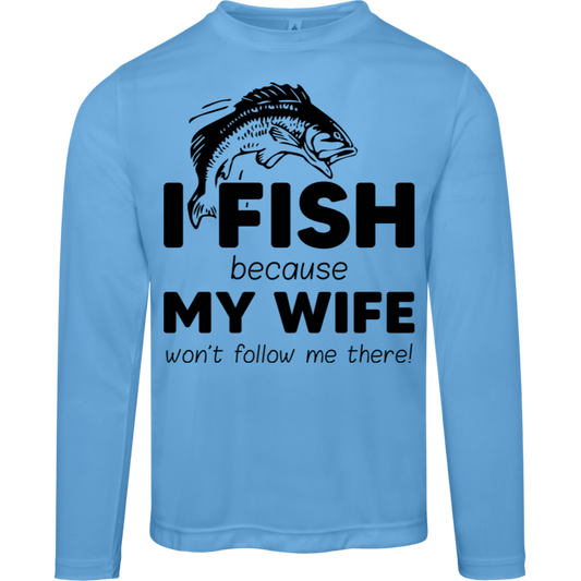 “I Fish Because My Wife Won't Follow Me There!” Moisture-Wicking Long Sleeve Tee – UV Protection for Anglers!
