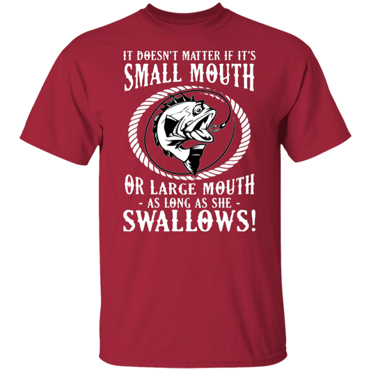Funny Fishing T-Shirt: "Small Mouth or Large Mouth, As Long As She Swallows!" – Perfect for Anglers and Fish Lovers!